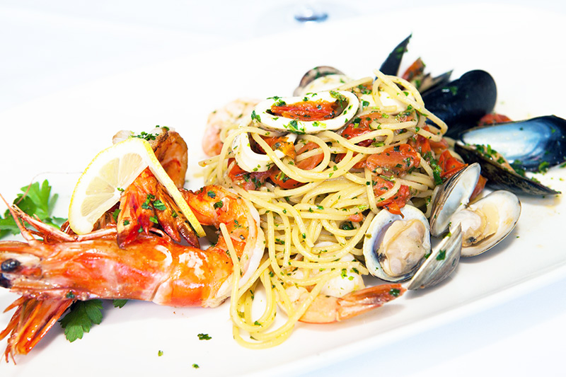 Cuando el ajo esté dorado, añadir una pizca de pimienta roja, coloca la langosta y calamares en la sartén y cocine hasta que el agua se haya evaporado, aproximadamente 2 minutos.