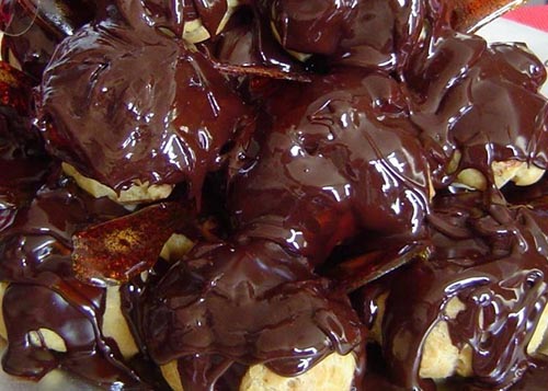 Derretir el chocolate con el agua a fuego muy lento, mezclar muy bien, añadir la leche condensada sin dejar de mezclar, cuando espese cubrir los profiteroles.